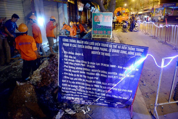 Công nhân thi công ngầm hoá lưới điện trong đêm tại đường Lê Quang Sung (Q.6, TP.HCM) – Ảnh: LÊ PHAN