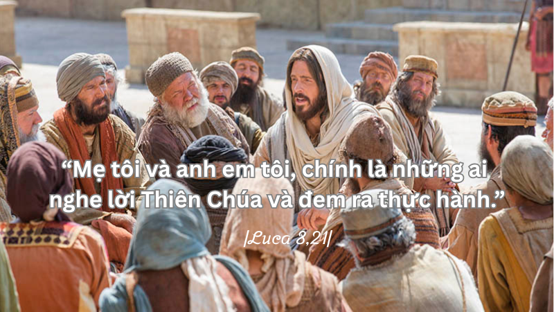 19 Khi ấy, mẹ và anh em Đức Giê-su đến gặp Người, mà không làm sao lại gần được, vì dân chúng quá đông. 20 Người ta báo cho Người biết: “Thưa Thầy, có mẹ và anh em Thầy đang đứng ngoài kia, muốn gặp Thầy.” 21 Người đáp lại: “Mẹ tôi và anh em tôi, chính là những ai nghe lời Thiên Chúa và đem ra thực hành.”