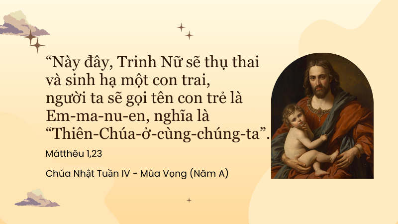 Bước vào Chúa Nhật IV Mùa Vọng, chúng ta cùng chiêm ngắm thánh Giuse – người công chính, biết lắng nghe và đón nhận sự hướng dẫn của Thiên Chúa. Qua ngài, chúng ta được mời gọi tín thác nơi Emmanuel – Thiên-Chúa-ở-cùng-chúng-ta, Đấng luôn đồng hành và soi sáng chúng ta trên hành trình đức tin.